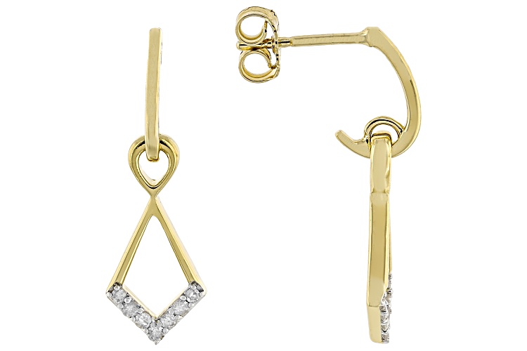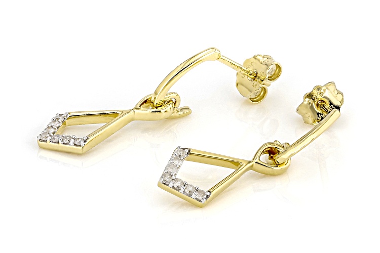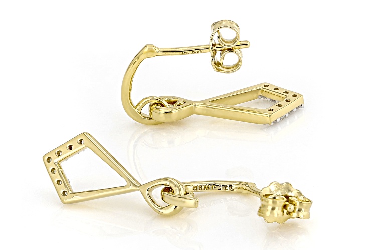 Engild™ 0.10ctw round white diamond, 14k yellow gold over sterling silver dangle earrings. Measures approximately 15/16"L x 5/16"W and have push back backings. White rhodium enhanced prongs.