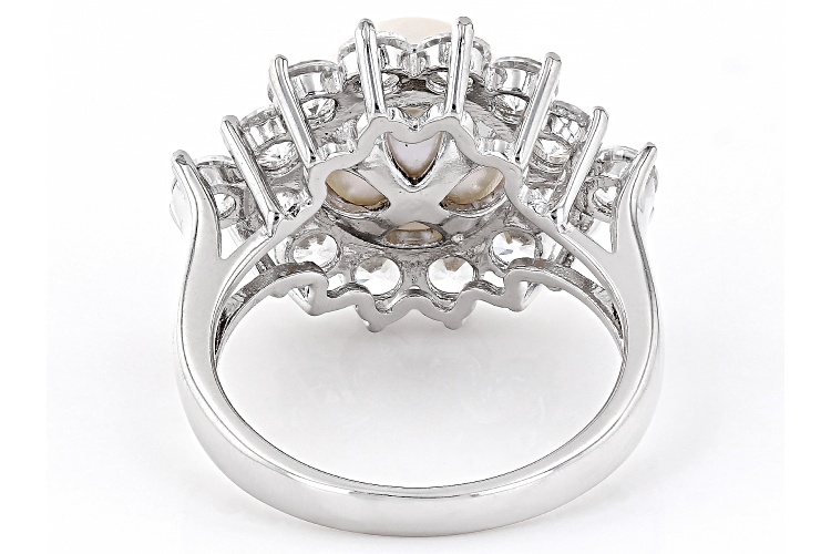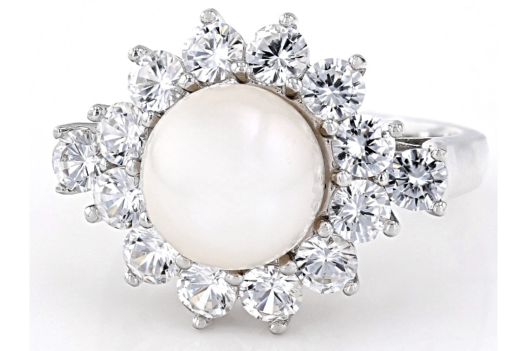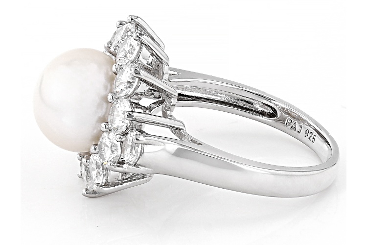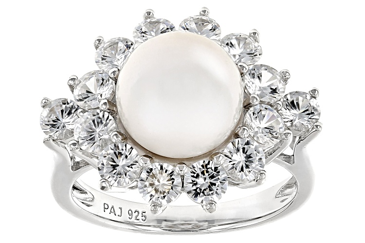 • 9.5-10mm White Cultured Freshwater Pearl and White Zircon Rhodium Over Sterling Silver Halo Ring - Size 11