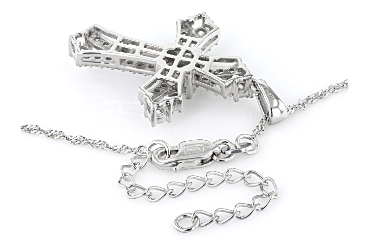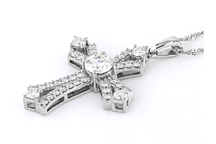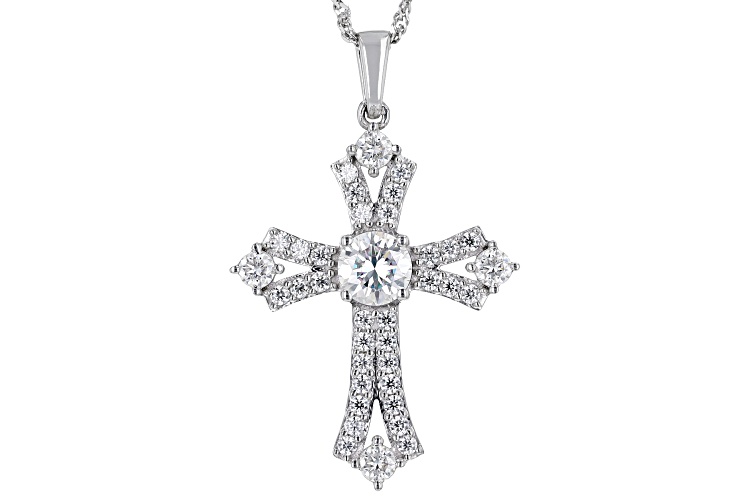 Moissanite Fire® 1.84ctw diamond equivalent weight round, Platineve(® cross pendant with 18 inch Singapore chain. Measures approximately 1 & 7/16" L x 15/16" W and has a lobster clasp and a 2 inch extender. Actual moissanite weight is 1.68ctw.