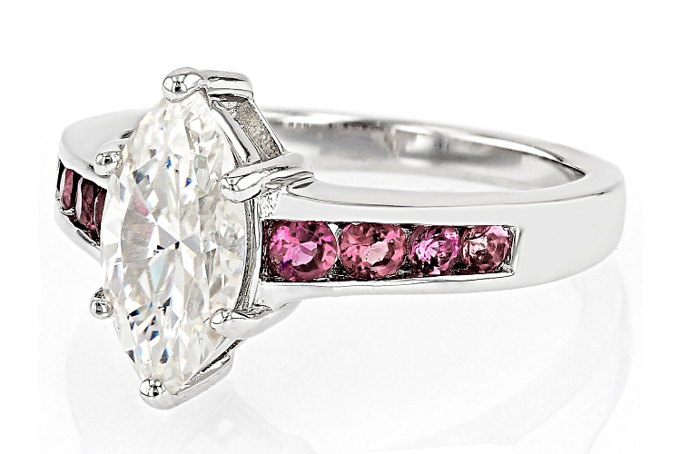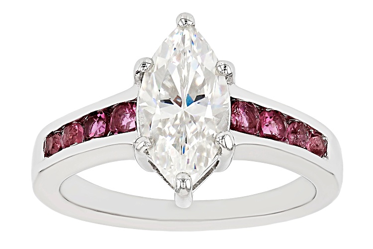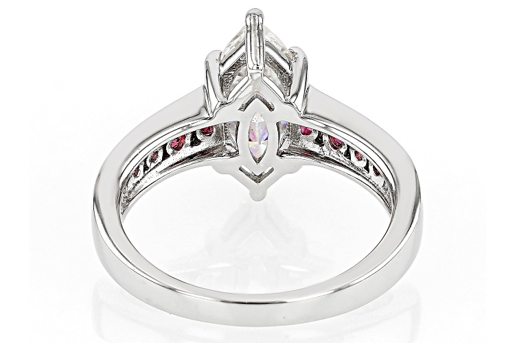 2.25ct marquise cut lab created Strontium Titanate and .32ctw round lab created bixbite, rhodium over sterling silver ring. Measures approximately 1/2" L x 1/16" W and is not sizeable.