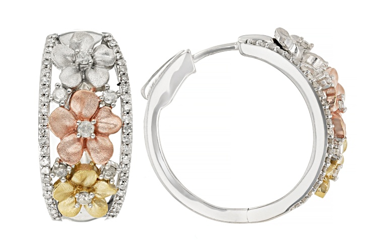 0.50ctw round white diamond, rhodium and 14K yellow and rose gold over sterling silver flower earrings. Features a matte sandblasted finish. Measures approximately 13/16"L x 3/8"W and have hinge with push lock backings.