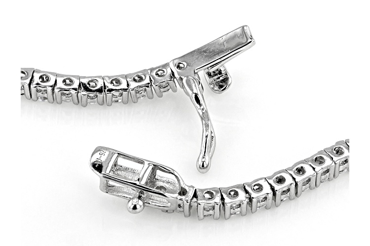 Bella Luce® white diamond simulant 11.48ctw round, rhodium over sterling silver riviera necklace. Necklace measures approximately 18.00" L x 0.06" W and has a hidden box clasp closure. Drop measures approximately 0.13" L x 0.69" W. The diamond equivalent weight is 6.95ctw.