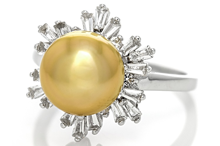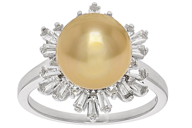 • 8-9mm Golden Cultured South Sea Pearl and White Topaz Rhodium Over Sterling Silver Ring - Size 10