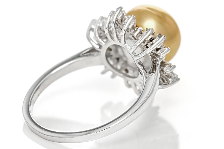 8-9mm Golden Cultured South Sea Pearl and 0.56ctw White Topaz Rhodium Over Sterling Silver Ring. Measures approximately 5/8" L x 5/8" W and is not sizeable. Colors, shapes, and sizes may vary.