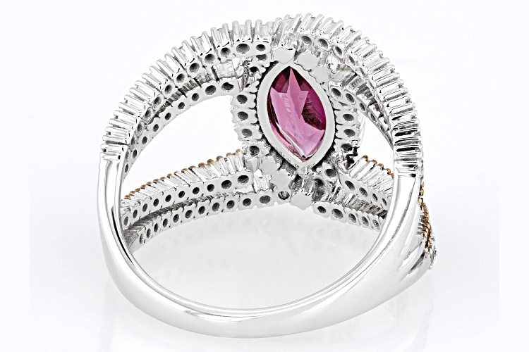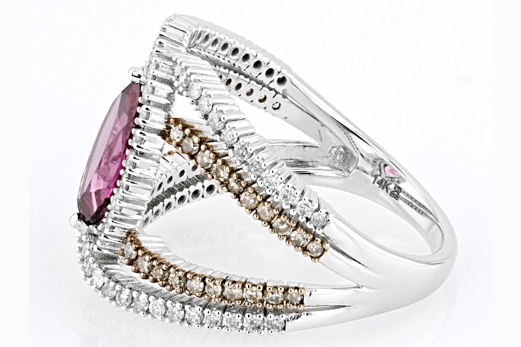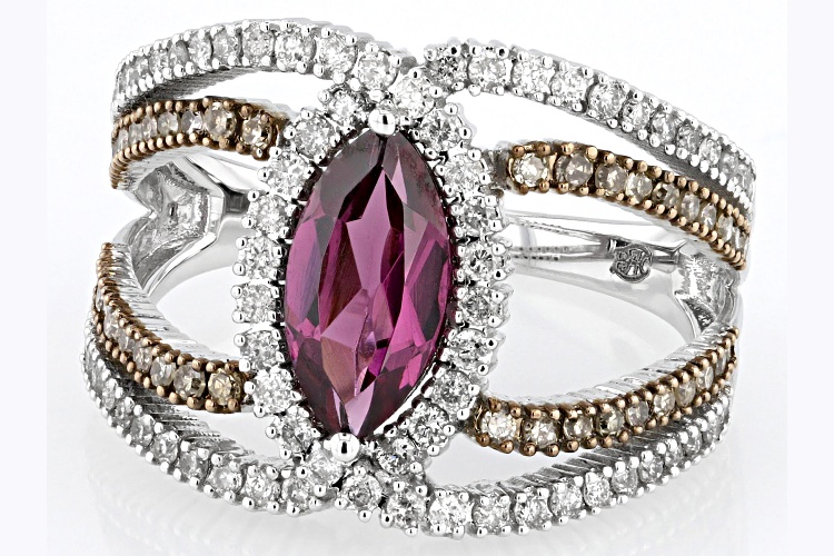 Park Avenue Collection® 1.48ctw marquise cut Rhodolite with .25ctw round champagne diamond and .50ctw round white diamond, rhodium over 14k white gold ring. Brown rhodium settings. Measures approximately 13/16"L x 1/16"W and is sizeable.