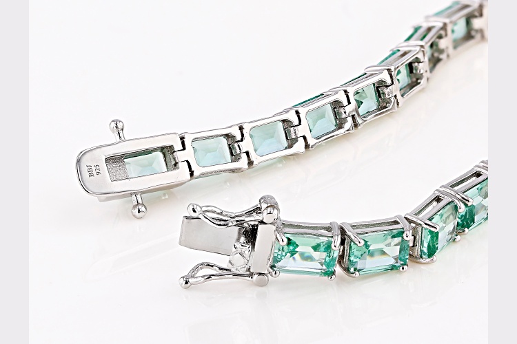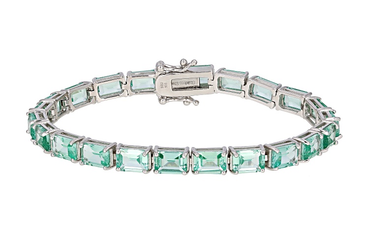 17.87ctw Emerald Cut Lab Created Green Spinel Rhodium Over Sterling Silver Tennis Bracelet. Measures approximately .21"W. Hidden Box Clasp. Double Safety. Stainless Steel Tongue. Color Varies.
