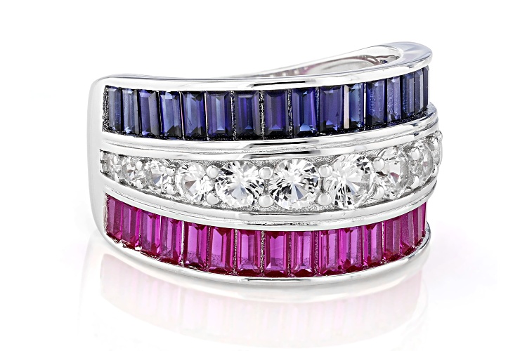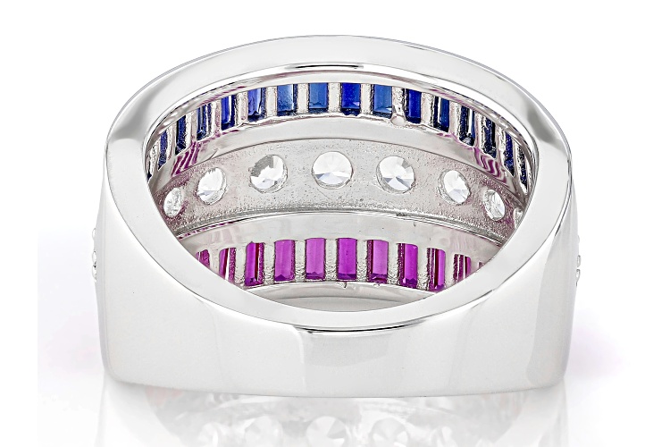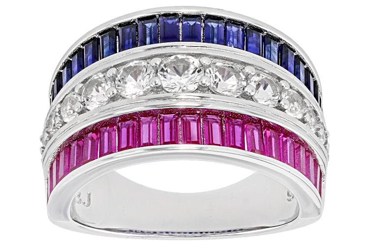 1.05ctw Baguette Lab Created Blue Sapphire with 1.05ctw Baguette Lab Created Ruby and 0.13ctw Round Lab Created White Sapphire Rhodium Over Sterling Silver Band Ring. Measures Approximately 0.91"L x 0.51"W. Not sizeable.