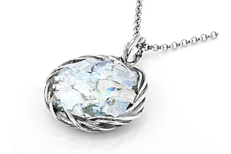 Artisan Collection of Israel™ 17mm Roman Glass Sterling Silver Rope Design Textured Pendant with Rolo Chain. Pendant measures approximately 1 3/16 of an inch in length by 13/16 of an inch in width, 3.4mm bail. Chain measures approximately 18 inches in length by 1/16 of an inch in width, 1.3mm gauge. Lobster Claw Clasp.