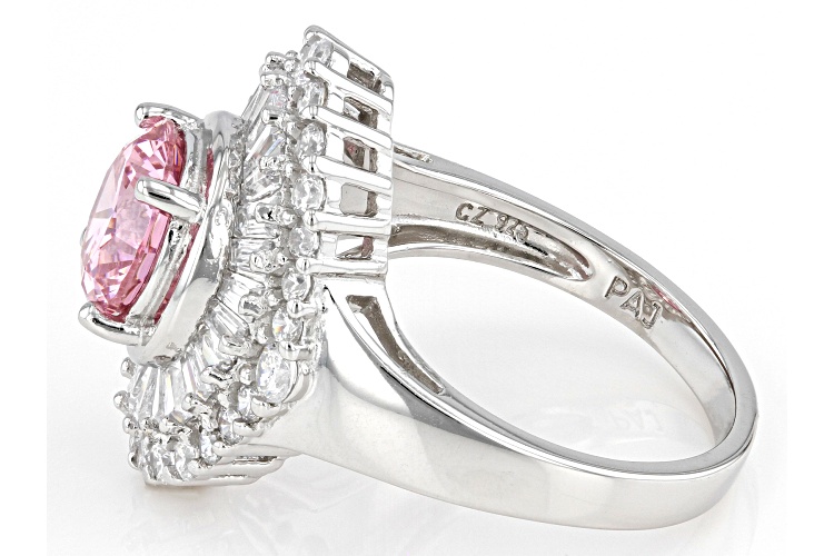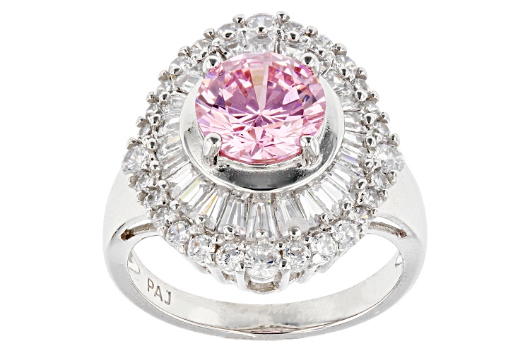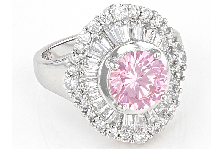 Bella Luce® pink and white diamond simulants 5.38ctw round and baguette, platinum over sterling silver ring. Measure approximately 0.81" L x 0.81" W and is not sizeable. The diamond equivalent weight is 3.26ctw.