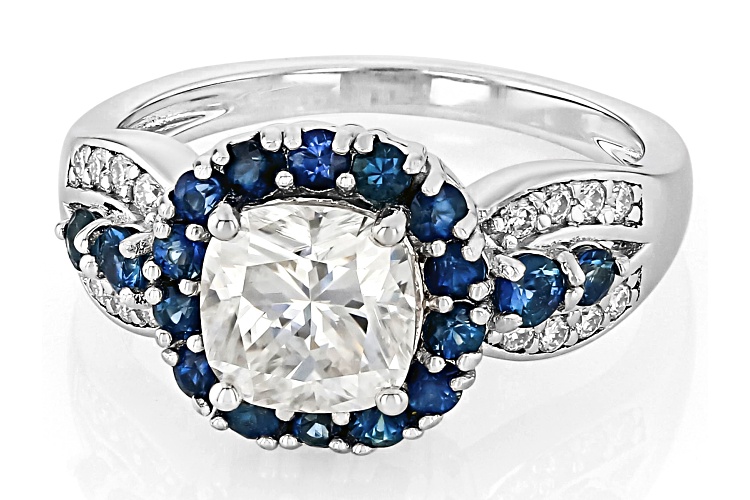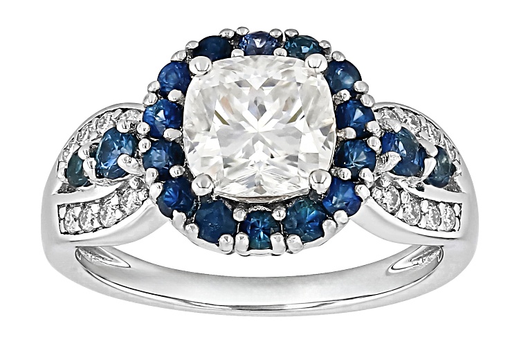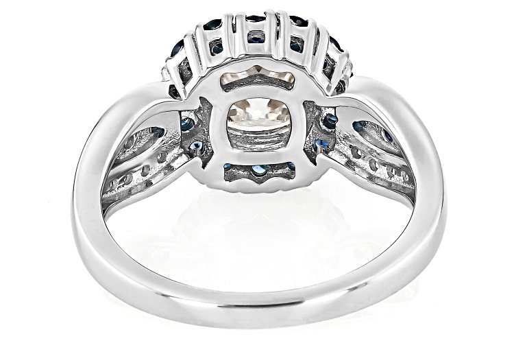 Moissanite Fire(R) 1.86ctw diamond equivalent weight square cushion cut and round brilliant with 0.90ctw round blue sapphire, Platineve® ring. Measures approximately 11/16" L x 7/16" W and is not sizeable. Actual moissanite weight is 1.65ctw.
