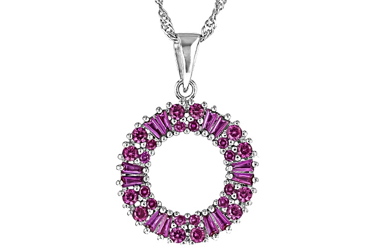 0.61ctw Baguette Lab Created Ruby With 0.64ctw Round Lab Pink Sapphire Rhodium Over Sterling Silver Pendant With 18"Singapore Chain. Measures Approximately 0.83"L x 0.71"W. 4mm bail. Lobster clasp with 2"extender.