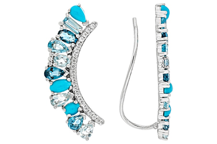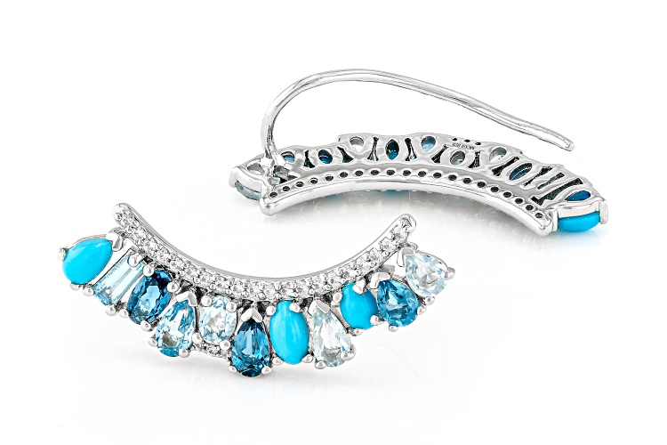 0.70ctw Pear Shape and 0.28ctw Oval Glacier Topaz™, 0.42ctw Baguette and 0.40ctw Pear Shape Swiss Blue Topaz, 0.70ctw Pear Shape and 0.34ctw Oval London Blue Topaz with Oval and Pear Shape Sleeping Beauty Turquoise and 0.26ctw Round White Zircon Platinum Over Sterling Silver Earrings. Measures Approximately 1.27"L x 0.25"W. Accent Stones Primarily Zircon.
