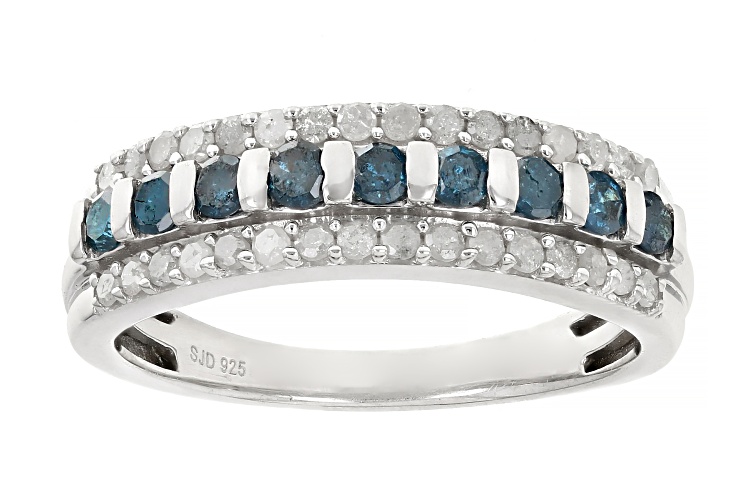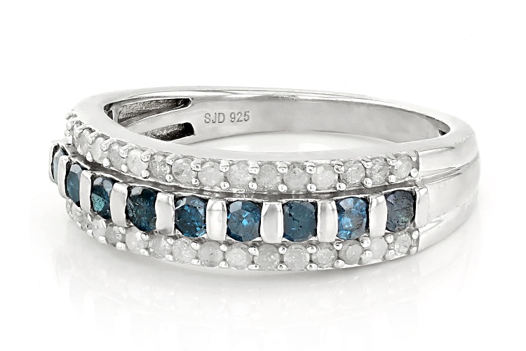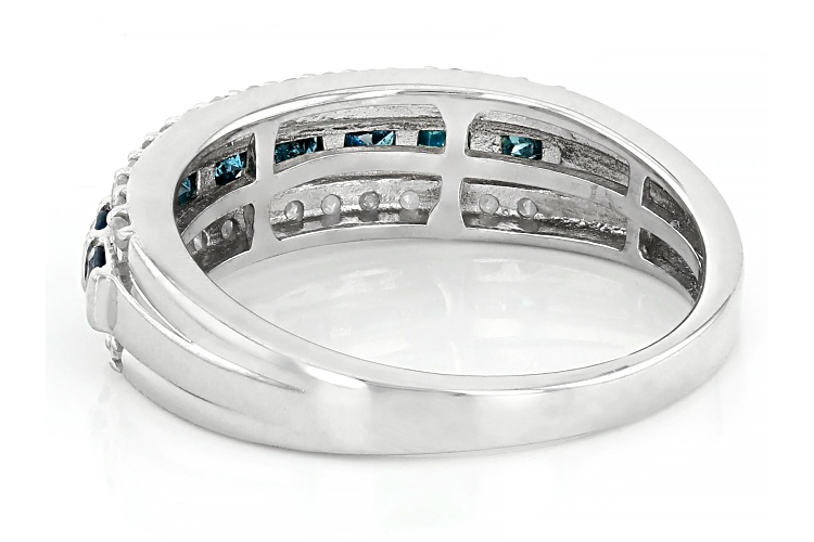 0.80ctw Round Blue And White Diamond Rhodium Over Sterling Silver Band Ring - Size 9