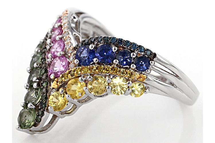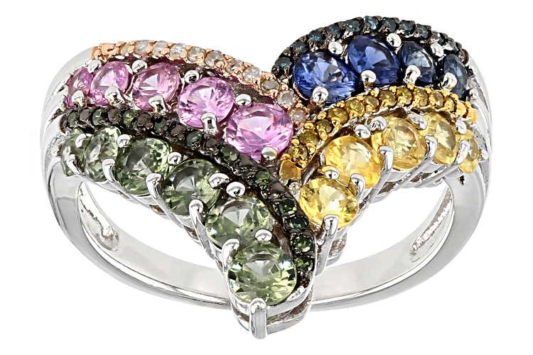 1.64ctw round blue, yellow, pink and green sapphire with .12ctw round white, yellow, blue and green diamond accents, rhodium over sterling silver chevron ring. Measures approximately .77"L X .72"W. Not sizeable. Color & pattern will vary.