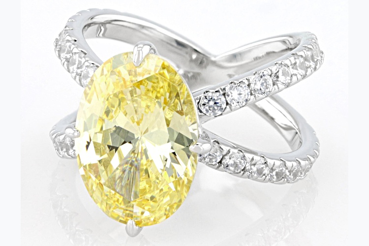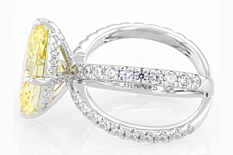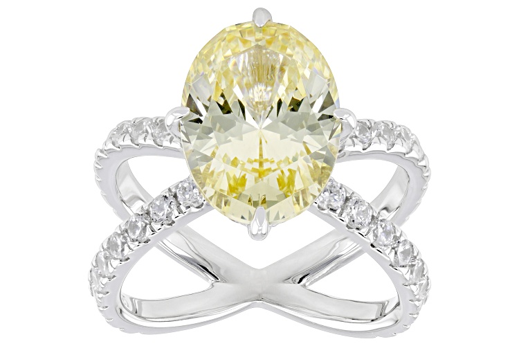 Bella Luce® canary and white diamond simulants 15.43ctw oval and round, rhodium over sterling silver ring. Measures approximately 0.81" L x 0.63" W and is not sizable. The diamond equivalent weight is 9.35ctw.
