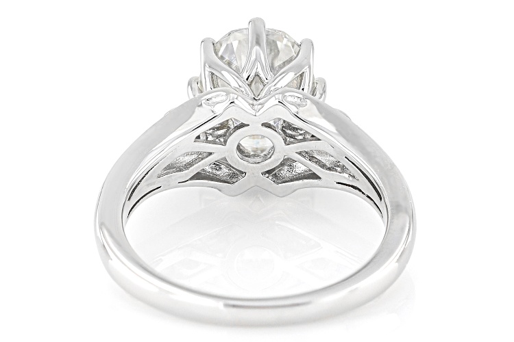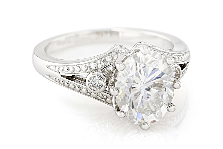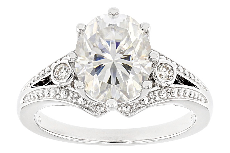 Moissanite Fire(R) 3.06ctw diamond equivalent weight oval and round brilliant Platineve® ring. Measures approximately 7/16" L x 1/16" W and is not sizeable. Actual moissanite weight is 2.78ctw.