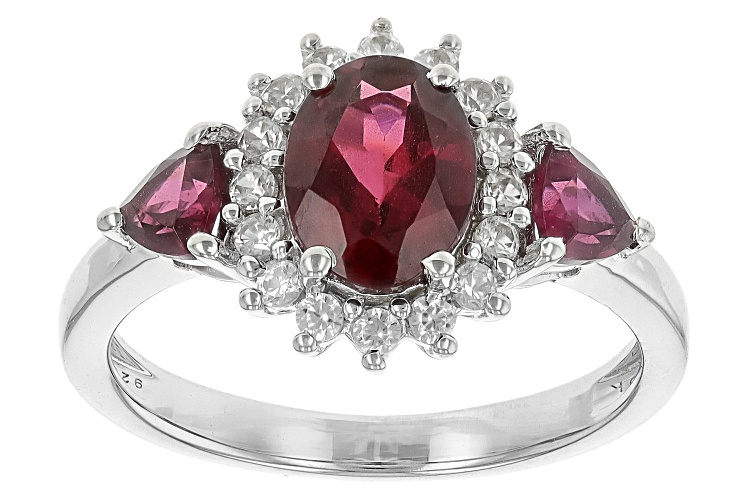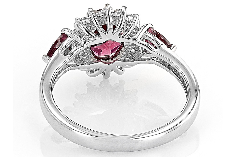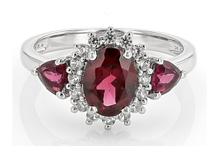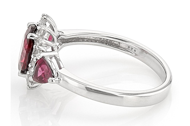 2.19ctw Oval and Trillion Raspberry Rhodolite with 0.27ctw Round White Zircon Rhodium Over Sterling Silver Ring. Measures approximately 0.72"L x 0.48"W. Not sizeable. Accent Stones Primarily Zircon.