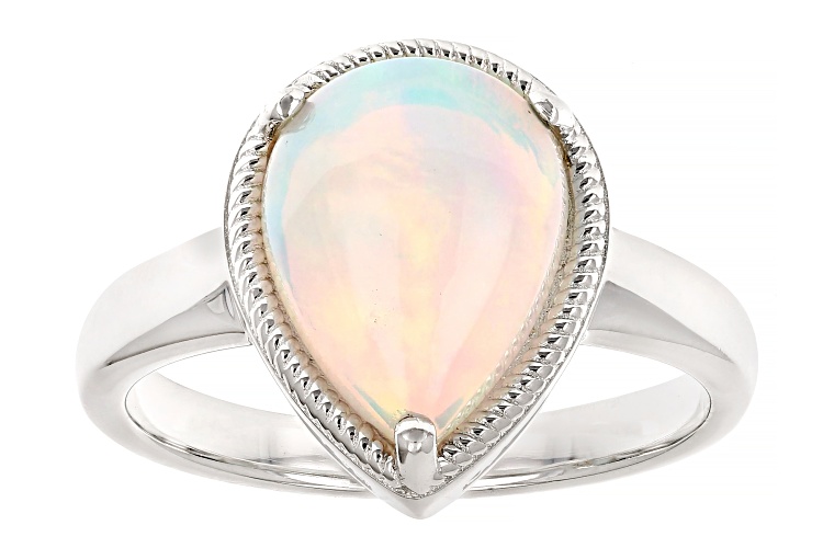 12x9mm Pear Shaped White Ethiopian Opal Rhodium Over Sterling Silver Ring. Measures Approximately 0.44"L x 0.54"W. Not sizeable.