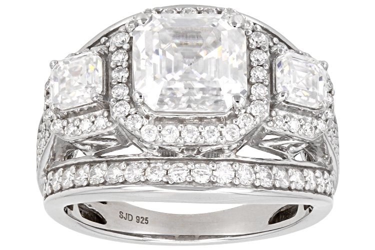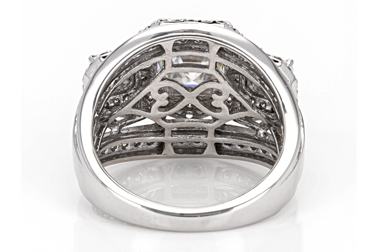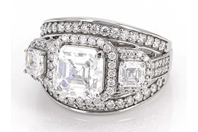 Moissanite Fire® 5.08ctw diamond equivalent weight asscher cut and round brilliant, Platineve® ring. Measures approximately 9/16" L x 1/16" W and is not sizeable. Actual moissanite weight is 3.87ctw.