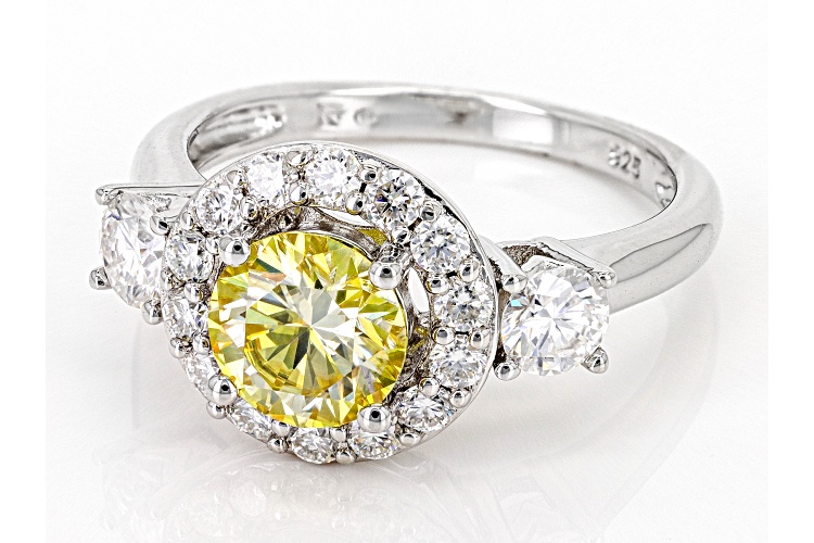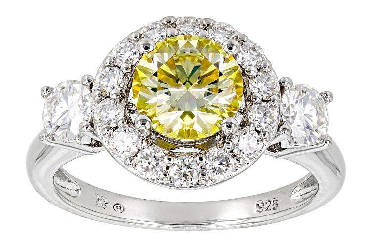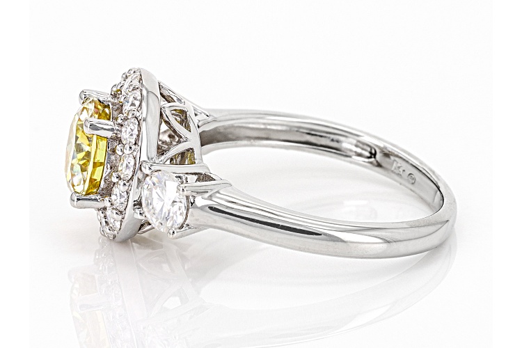 Pre-Owned Moissanite Fire(R) and yellow moissanite 2.08ctw diamond equivalent weight round brilliant Platineve(R) ring. Measures approximately 7/16" L x 1/16" W and is not sizeable. Actual moissanite weight is 1.96ctw. . This product may be a customer return, vendor sample, or on-air display and is not in its originally manufactured condition. It may not be new. In some instances, these items are repackaged by JTV.