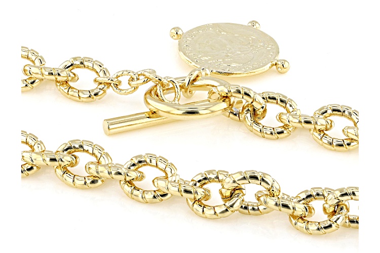 Moda Al Massimo 18K Yellow Gold Over Bronze Textured Oval Chain Coin Necklace. Measures Approximately 20" L x 7/16" W with a Toggle Clasp Closure. Made In Italy.