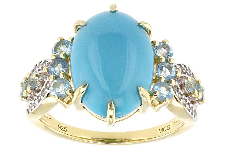 14x10mm Oval Blue Sleeping Beauty Turquoise With 0.59ctw Round Swiss Blue Topaz and 0.09ctw Round White Zircon 18k Yellow Gold Over Sterling Silver Ring. Measures Approximately 0.85"L x 0.60"W. Not Sizeable. Accent Stones Primarily Zircon.