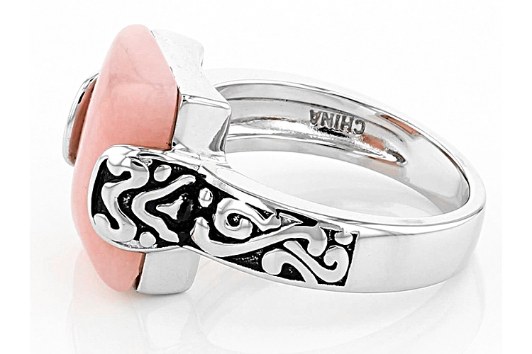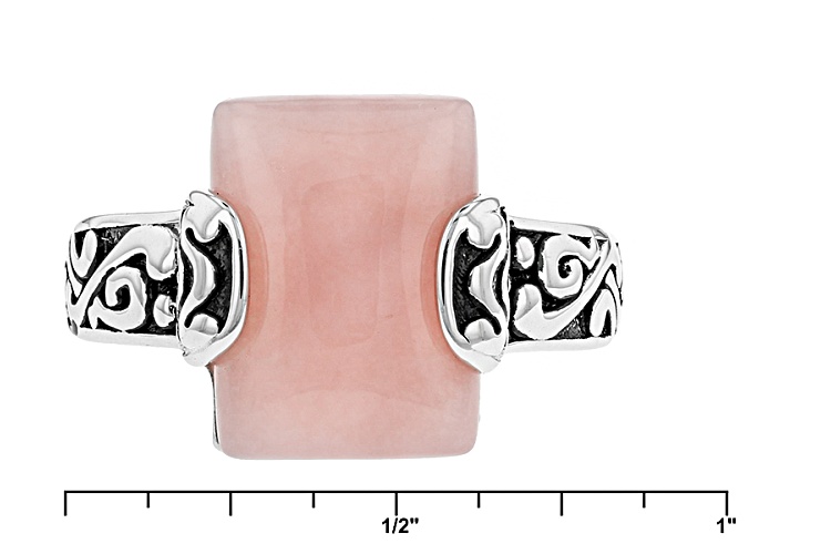 14x10MM rectangular cabochon Peruvian pink opal rhodium over sterling silver ring. Measures approximately 9/16"L x 1/8"W. Not sizeable. Oxidized.