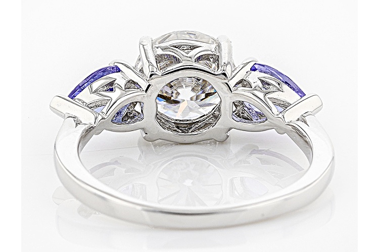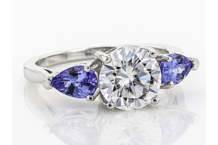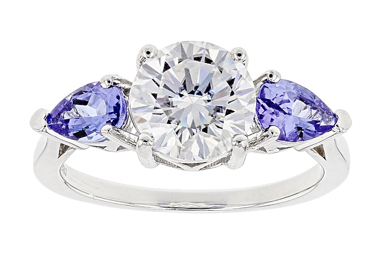 Moissanite Fire® 1.90ct Dew Round And .78ctw Pear Shape Tanzanite Platineve™ Ring - Size 6