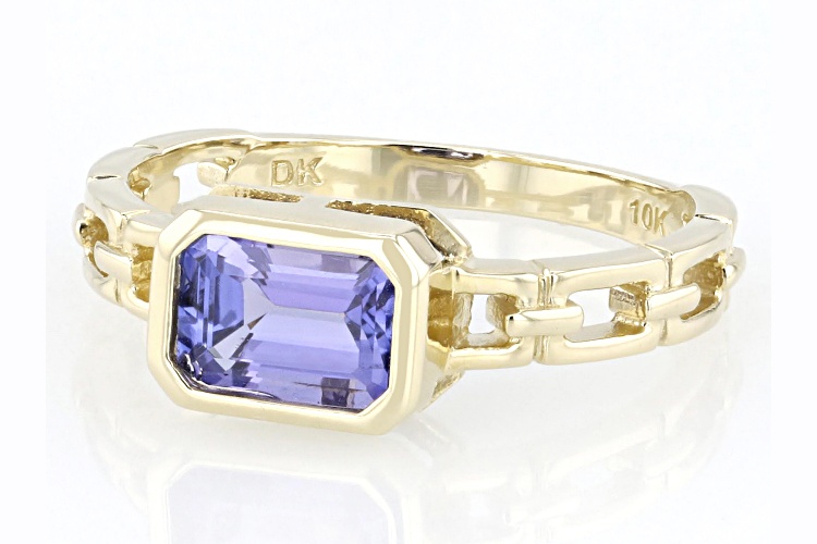 0.85ct Rectangular Octagonal Blue Tanzanite 10k Yellow Gold Ring. Measures Approximately 0.35"L x 0..25"W.