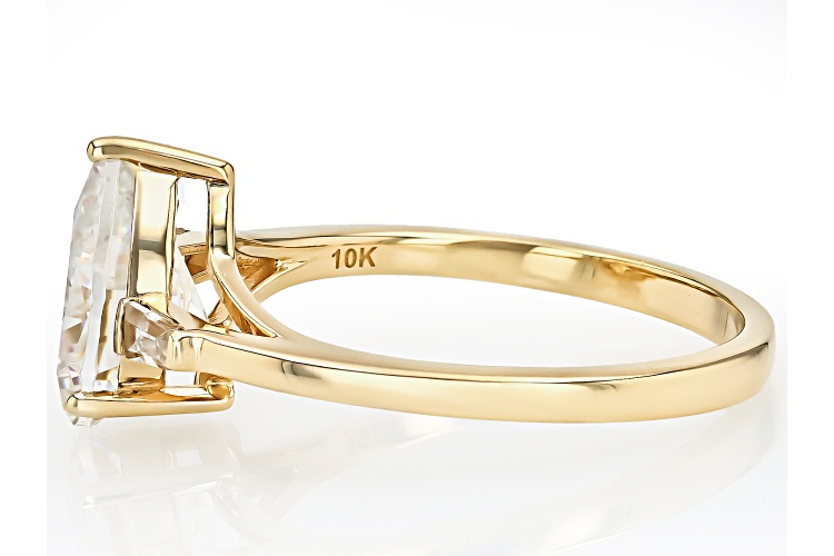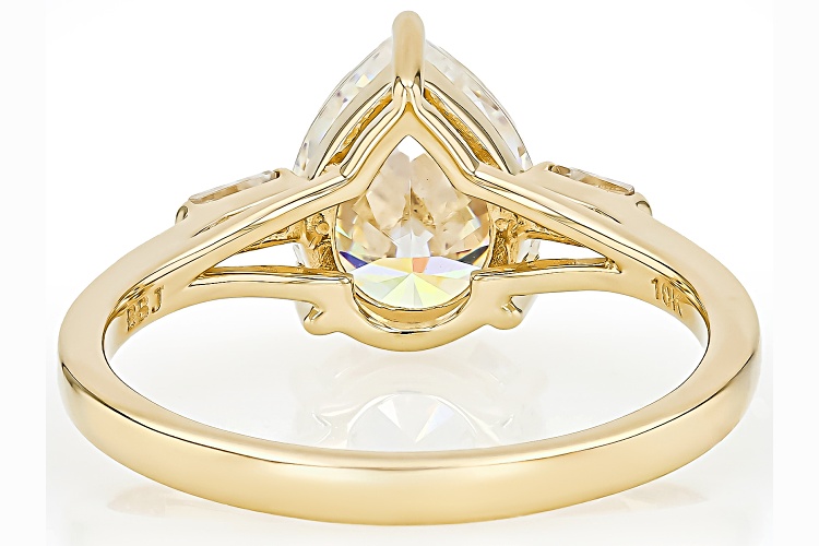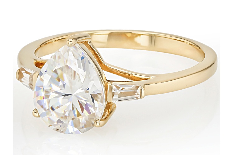 2.99ct Pear Shape Lab Created Strontium Titanate With 0.17ctw Baguette White Zircon 10k Yellow Gold Ring. Measures Approximately 0.58"L x 0.41"W. Accent Stones Primarily Zircon.