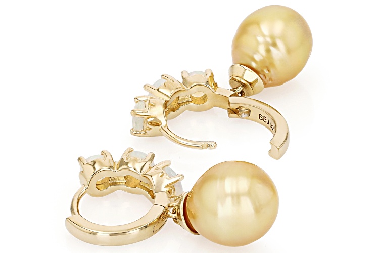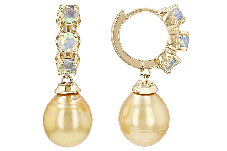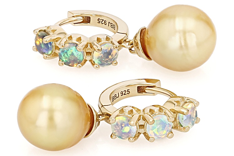 9mm Golden Cultured South Sea Pearl With Ethiopian Opal 18k Gold Over Silver Earrings