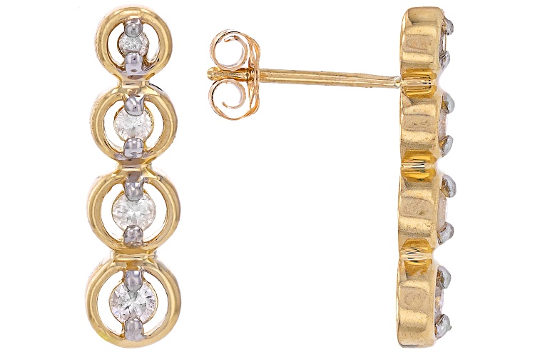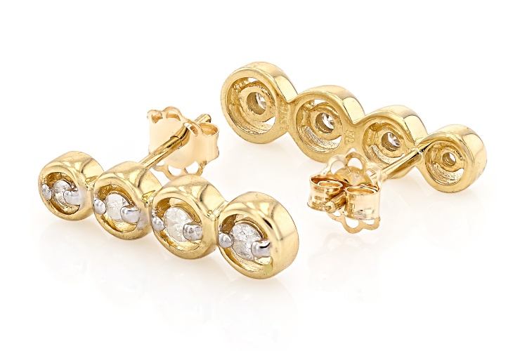 0.20ctw round white diamond, 10k yellow gold drop earrings. Measure approximately 5/8"L x 3/16"W and are secured with push back backings. Rhodium enhanced settings.