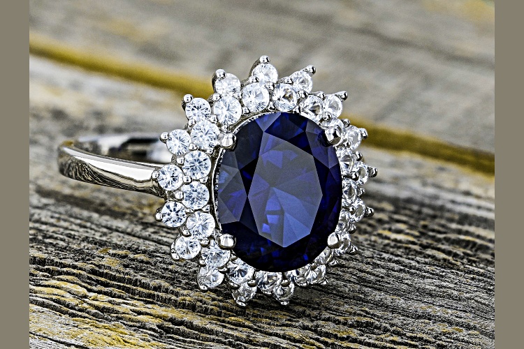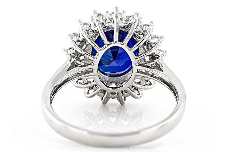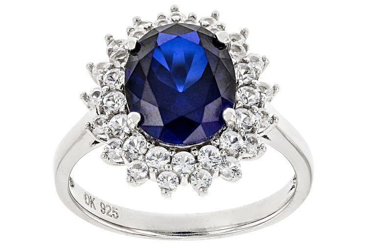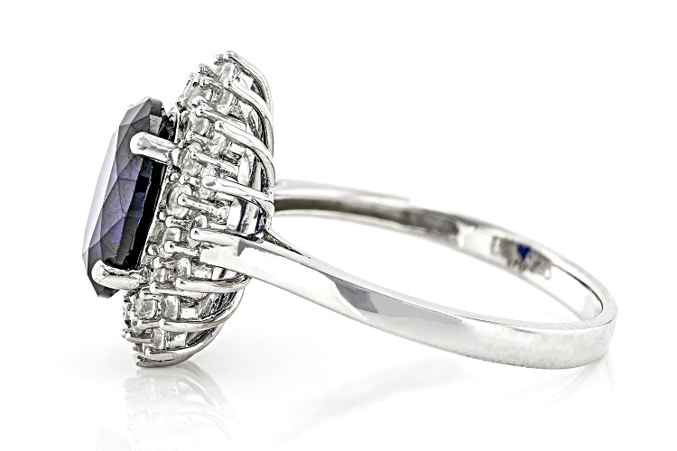 3.74ct oval lab created blue sapphire with 1.03ctw round lab created white sapphire rhodium over sterling silver halo ring. Measures approximately .63"L x .69"W. Not sizeable.