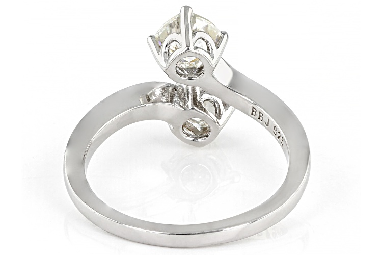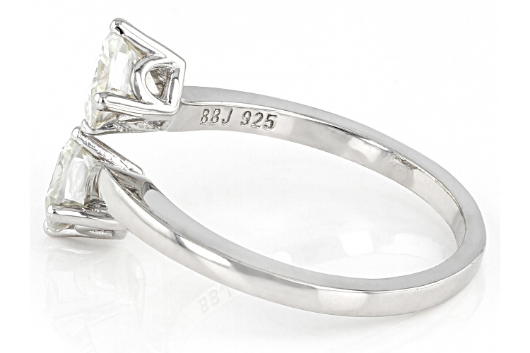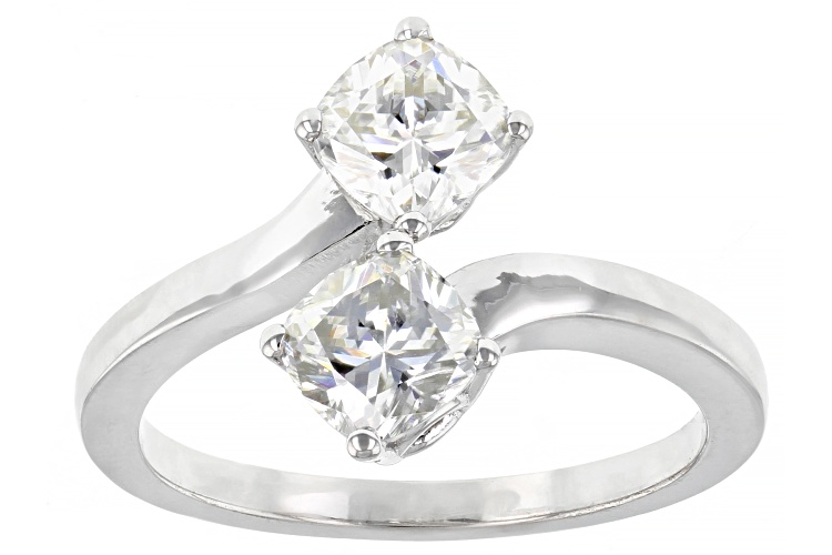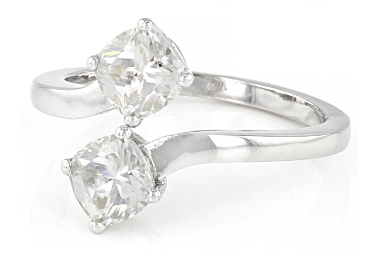 Moissanite Fire(R) 1.60ctw diamond equivalent weight square cushion cut Platineve(R) ring. Measures approximately 9/16" L x 1/16" W and is not sizeable. Actual moissanite weight is 1.50ctw.