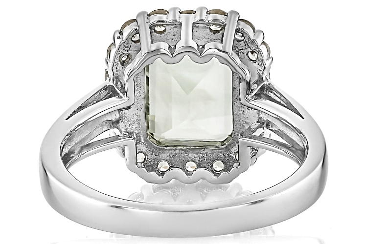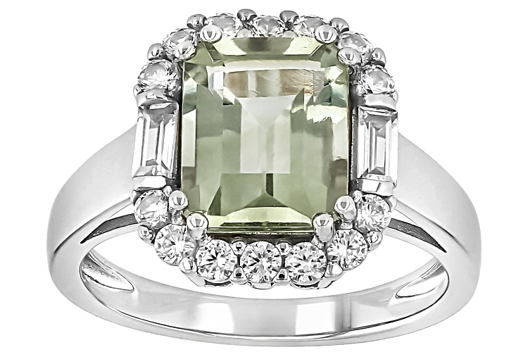 • 2.50ct Rectangular Octagonal Prasiolite With 0.89ctw White Zircon Rhodium Over Sterling Silver Ring - Size 9