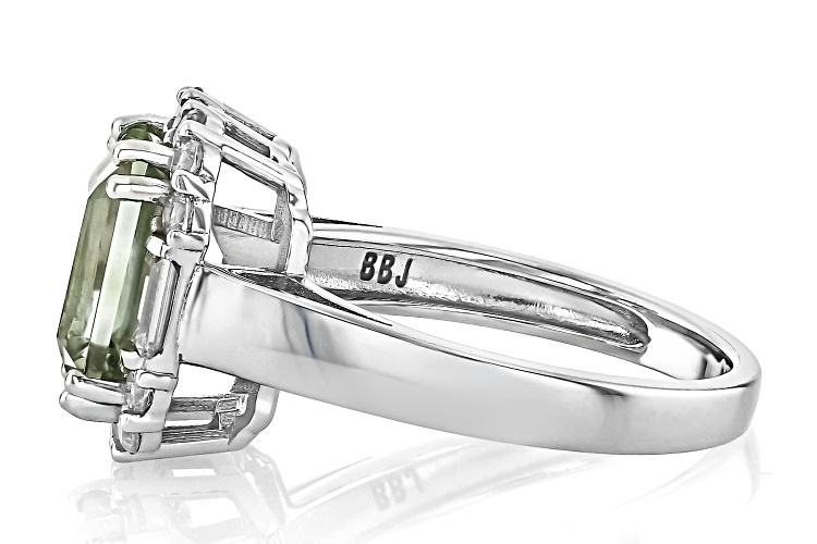 2.50ct Rectangular Octagonal Prasiolite With 0.26ctw Baguette And 0.63ctw Round White Zircon Rhodium Over Sterling Silver Ring. Measures Approximately 0.85"L x 0.56"W. Not sizeable. Accent stones primarily zircon.