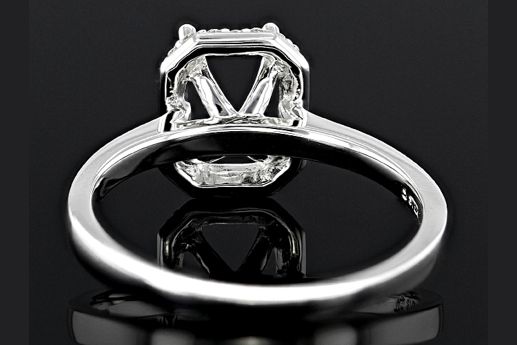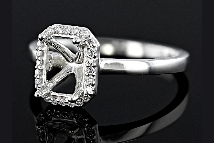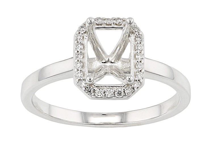 Sterling Silver 9x7mm Emerald Cut halo style ring semi-mount with 30 1.0mm round white diamond accents, 4-prong setting