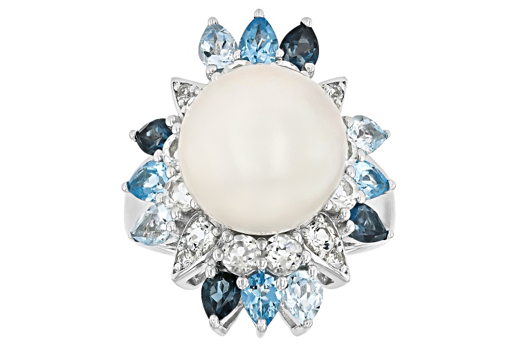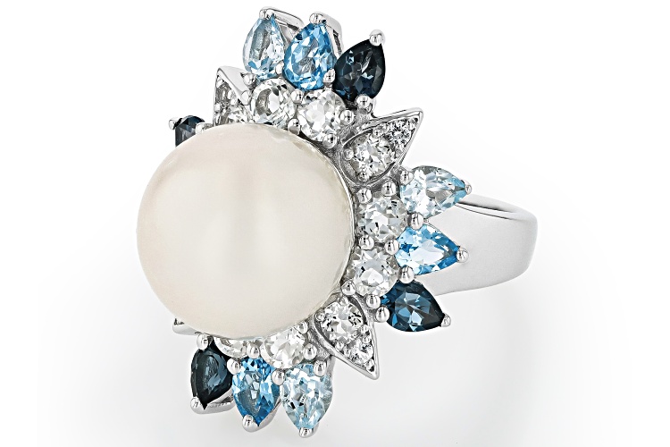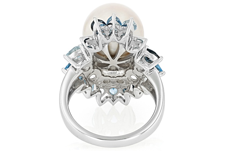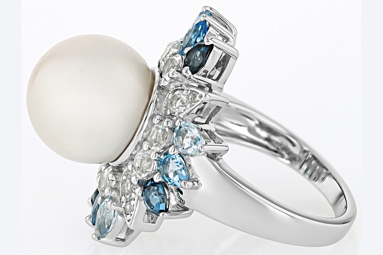 12mm White Cultured Freshwater Pearl With 2.34ctw Blue And 1.59ctw White Topaz Rhodium Over Sterling Silver Ring. Measures approximately 13/16" L x 15/16" W and is not sizeable. Colors, shapes, and sizes may vary.