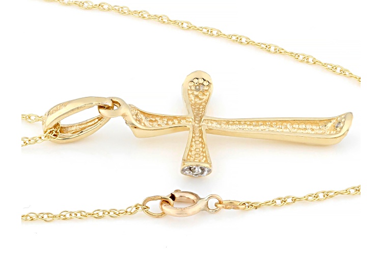 Round white diamond accent, 10k yellow gold cross pendant with an 18 inch rope chain. Chain is secured with a spring ring clasp. Pendant measures approximately 1 & 1/8"L x 1/2"W and has a 2.0mm bail. Rhodium enhanced settings.