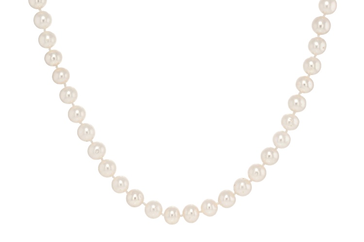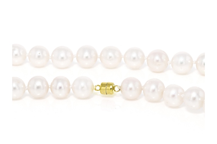 8mm White Cultured Freshwater Pearl 14k Yellow Gold 18 Inch Strand Necklace. Measures approximately 5/16 of an inch in width and has a magnetic clasp. Colors, shapes, and sizes may vary.