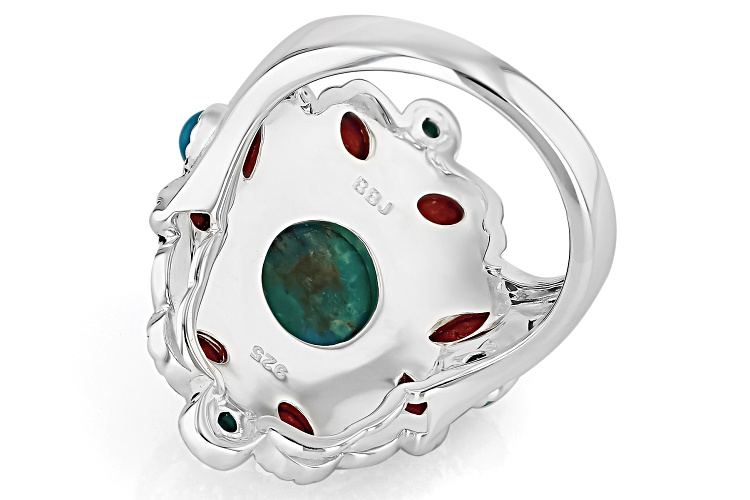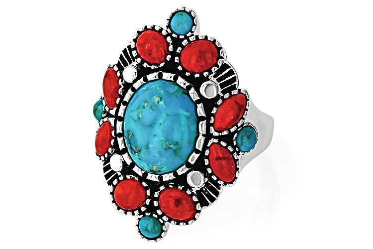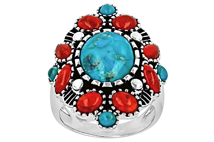 Step into a world of bold elegance with our Blue Composite Turquoise & Red Sponge Coral Sterling Silver Statement Ring from Southwest Style by JTV™. This exquisite piece features stunning turquoise stones bound together to create an eye-catching design that is as unique as it is beautiful. The composite turquoise showcases intricate cabochon cuts in various shapes and sizes, paired harmoniously with the vibrant red sponge coral gemstone for a pop of color.