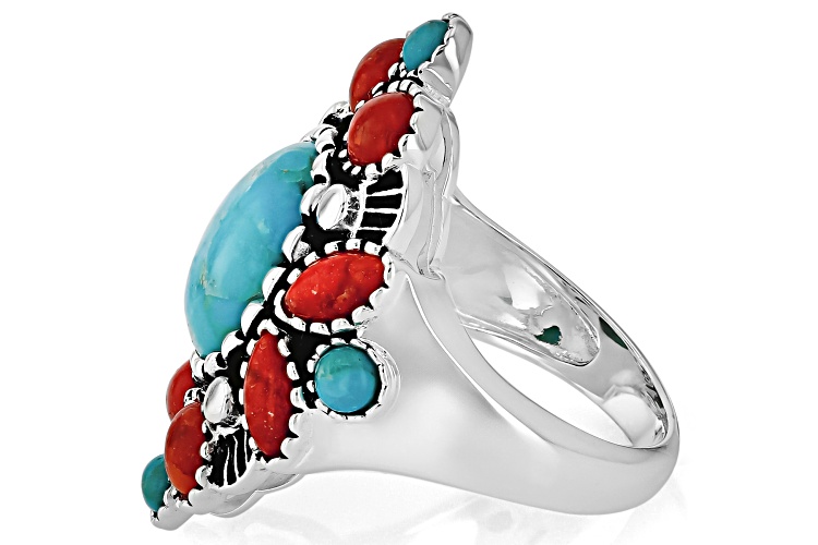 • Southwest Style by JTV™ 12x10mm Turquoise & Red Sponge Coral Sterling Silver Ring - Size 6