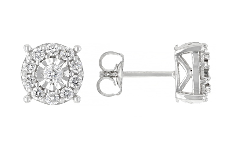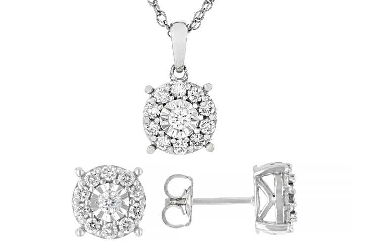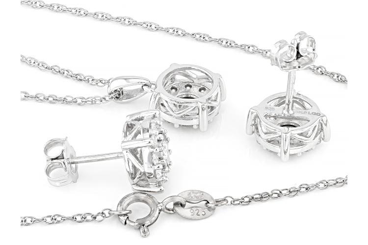 Prazana® Lab-Grown Diamonds 1.00ctw round white lab-grown diamond, rhodium over sterling silver cluster stud earrings and cluster pendant jewelry set. Pendant suspends from an 18 inch rope chain with a spring ring clasp. Pendant measures approximately 9/16"L x 5/16"W and has a 2.0mm bail. Earrings measure approximately 5/16"L x 5/16"W and are secured with push back backings. H color, SI clarity minimum.
