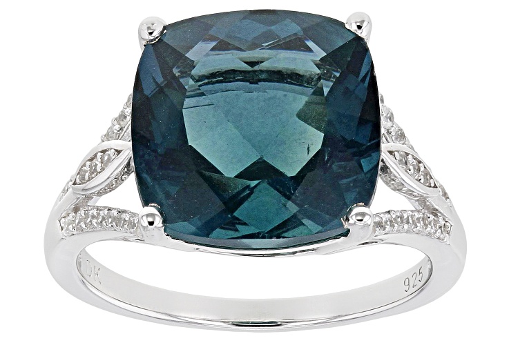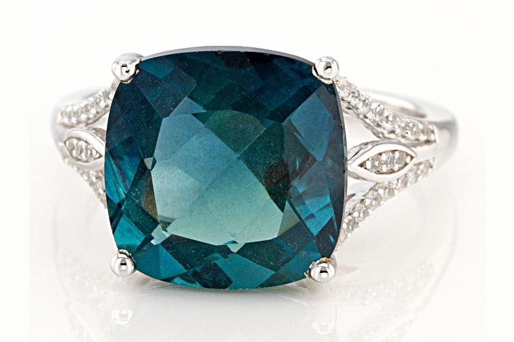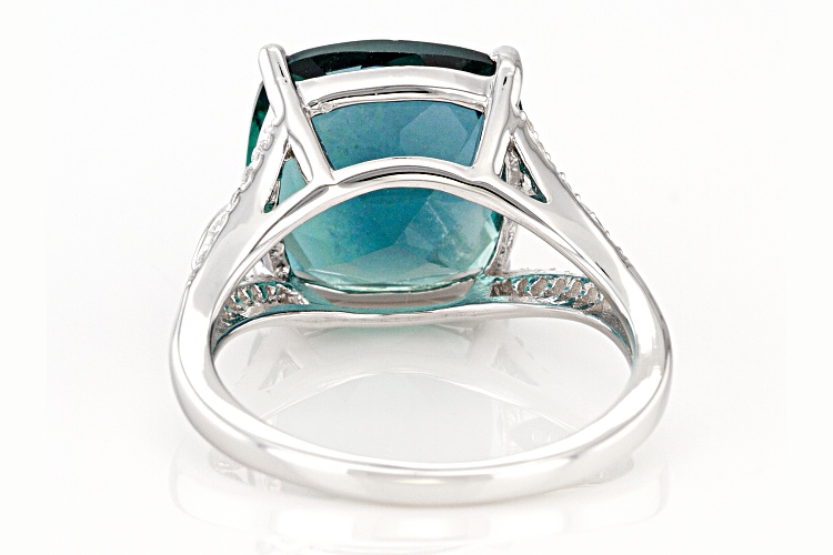 • 7.23ct Square Cushion Teal Fluorite and .17ctw Round White Zircon Rhodium Over Silver Ring - Size 7