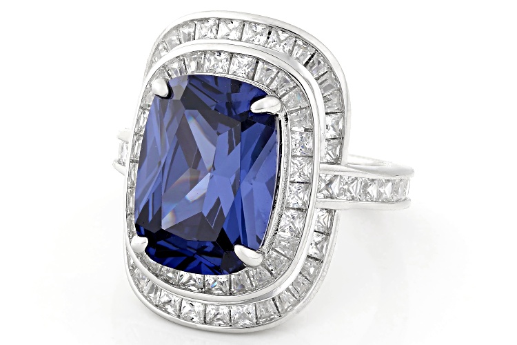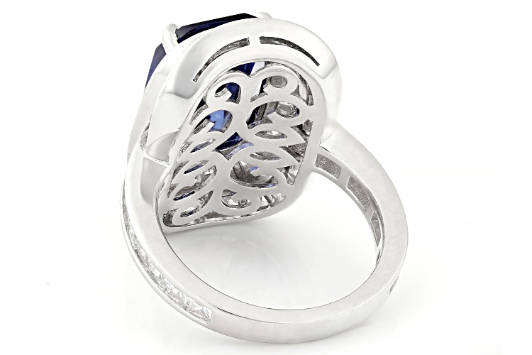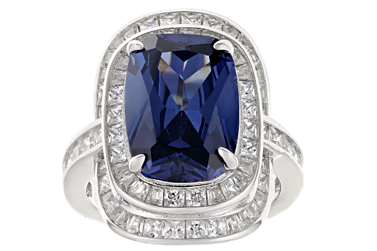 Bella Luce® Esotica™ tanzanite and white diamond simulants 14.69ctw rectangle, square, and tapered baguette, rhodium over sterling silver ring. Measures approximately 0.65"L x 0.9"W and is not sizable.