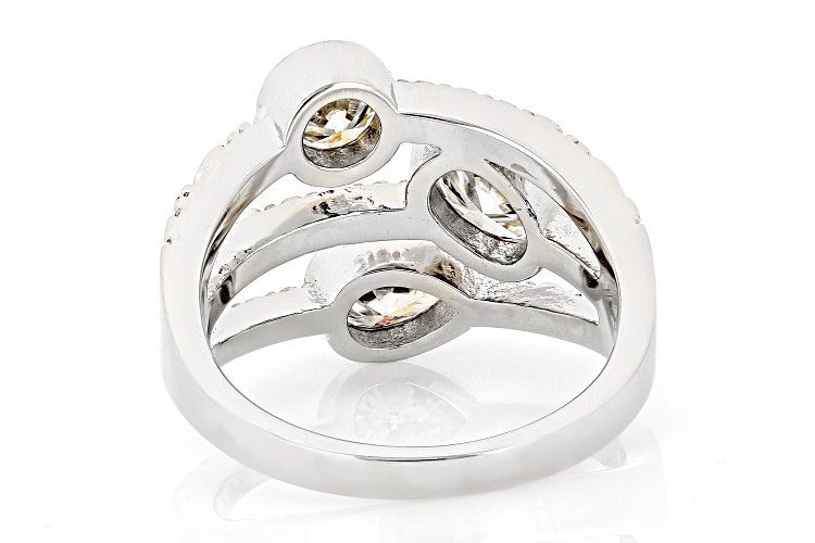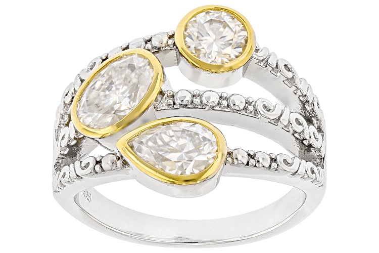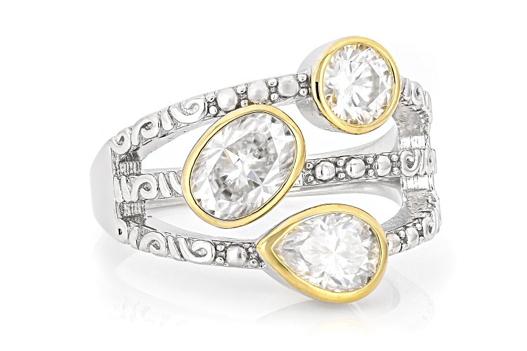 Moissanite Fire® 2.18ctw diamond equivalent weight oval, pear shape and round, Platineve® and 14k yellow gold over sterling silver ring. Measures approximately 9/16" L x 5/8" W and is not sizeable. Actual moissanite weight is 1.93ctw.