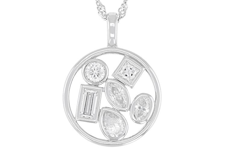 Moissanite Fire® 2.17ctw diamond equivalent weight pear, marquise, oval, round, baguette and square princess cut, Platineve® circle pendant with an 18 inch Singapore chain. Measures approximately 1 & 1/16 "L x 3/4 "W. Chain has a lobster clasp and 2 inch extender. Actual moissanite weight is 1.90ctw.