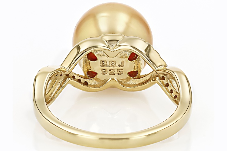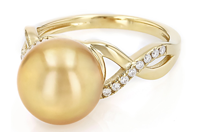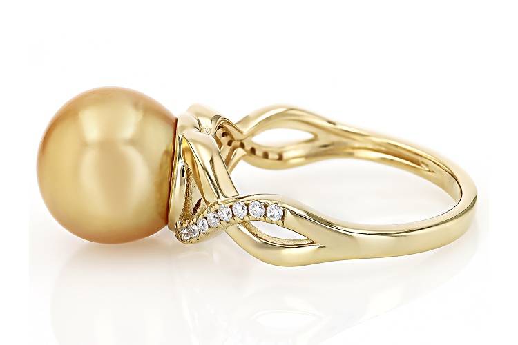 9mm Golden Cultured South Sea Pearl With 0.12ctw Moissanite Fire® 18K Yellow Gold Over Sterling Silver Ring. Diamond equivalent weight is 0.12ctw. Measures approximately 3/4" L x 3/8" W and is not sizeable. Colors, shapes, and sizes may vary.