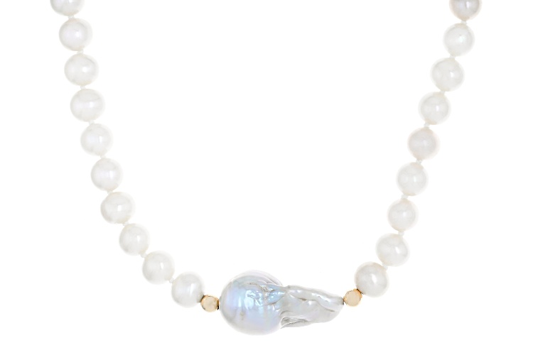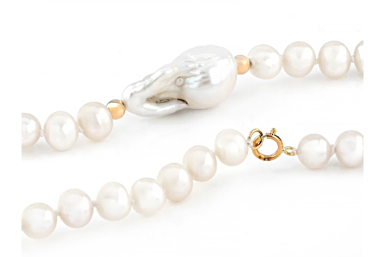 Genusis™ 6-16mm White Cultured Freshwater Pearl 14k Yellow Gold 18 Inch Strand Necklace. Measures approximately 1/2 of an inch in width and has a spring ring clasp. Colors, shapes, and sizes may vary.