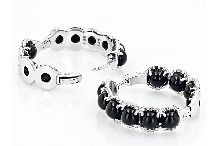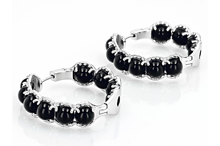 6mm Round Cabochon Black Onyx Rhodium Over Sterling Silver Inside And Outside Hoop Earrings. Measures Approximately 1.35"L x 0.38"W. Hinge with Notched backings.